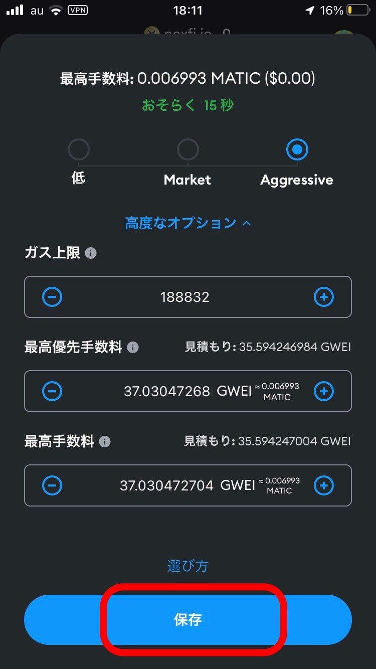 優先的に処理されるようにガス代をAggressive(緑の枠で囲んだところ)を選択し、保存(赤い枠で囲んだところ)をタップします。