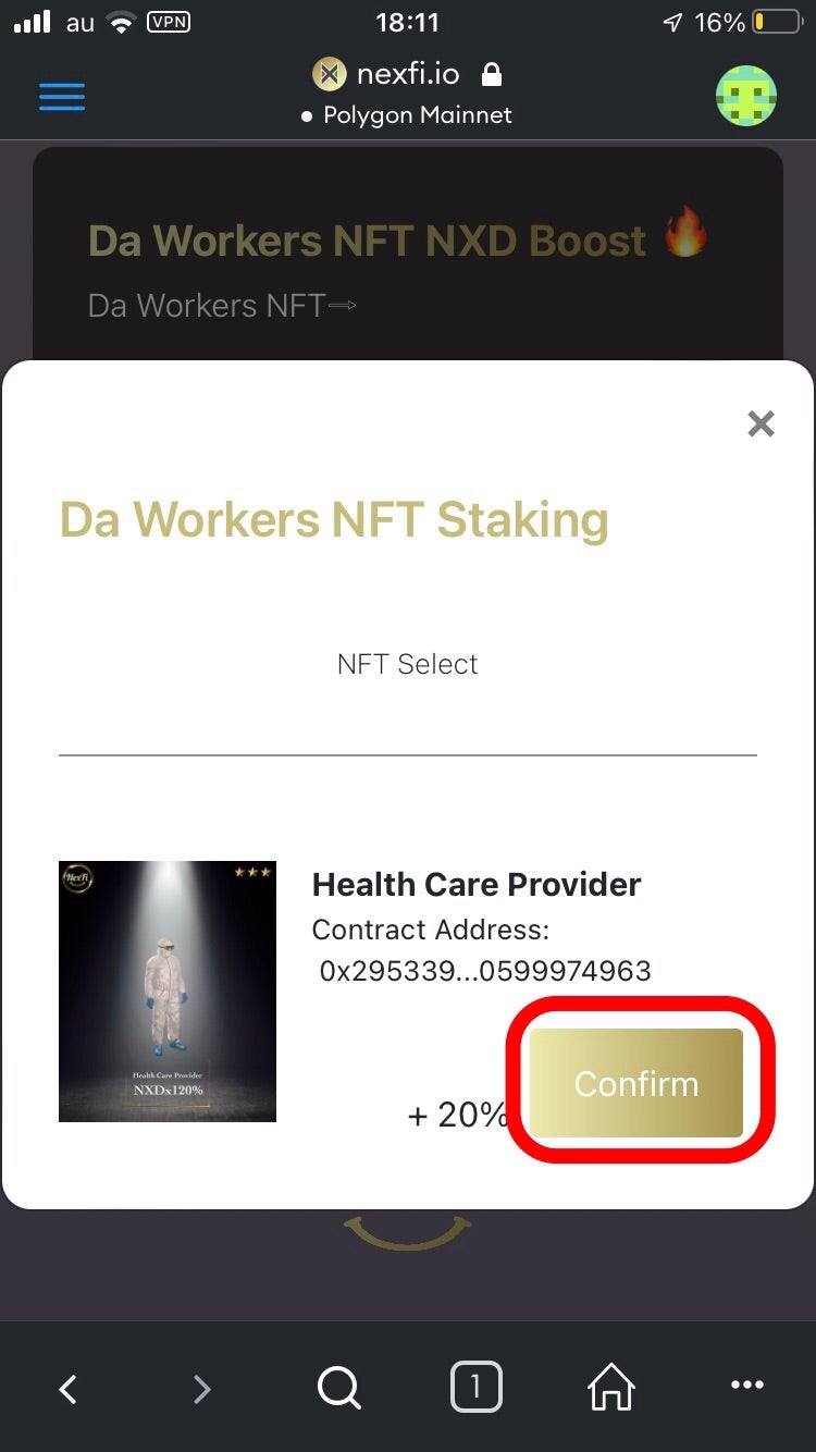 Da Workers NFT Stakingの画面が表示されるので、Boostで利用したいNFTのConfirm(赤い枠で囲んだところ)をタップします。